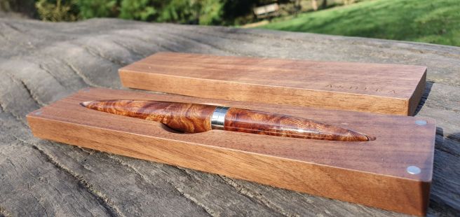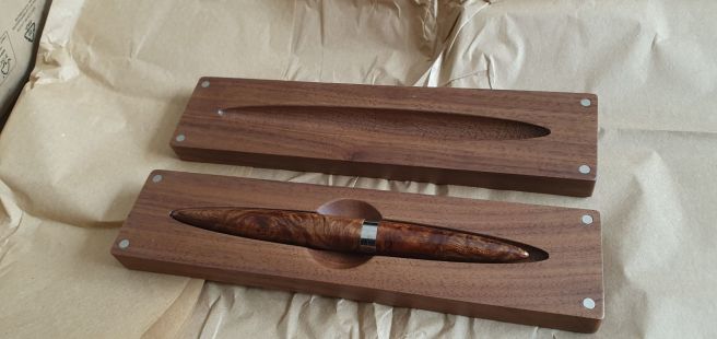 I took the pen and its box along to my pen club. There was universal acclaim for the walnut wood box, the magnetic closure and then for this extraordinary pen, with its stunning lacquered wood grain and long tapering contours, nestled in its custom box.