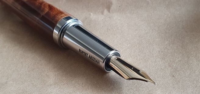 There is no inner cap. Whilst I found that none is needed here to prevent hard starts, I had a concern that ink drops could stain the inside of the cap, if the pen were to leak or be shaken in transit. However I am told that the cap is also lacquered from the inside, just like the outside. The lacquer is low viscosity and penetrates deeply into the wood fibres. If necessary, the inside of the cap could be cleaned with a cotton bud. Ashera advise against soaking the cap or barrel in water.