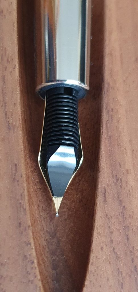The nib that I chose is 14k gold, in a fine. I did ask why there was no name or logo on the nib, but only the gold description “14K-585”. This is to showcase the beauty of the gold (or platinum), and ironically, costs more to produce than if an imprint was present. Each nib is hand-polished individually for maximum gloss and hand-tuned and tested to ensure that the tine spacing is just right. This is quality control at its best.