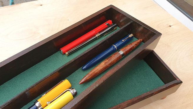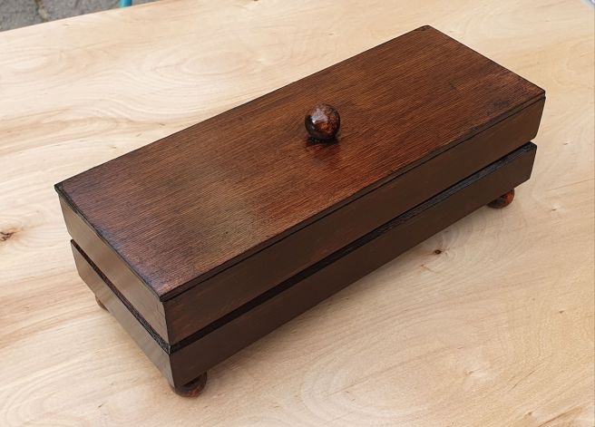 This work is done by artisans and not a skill that you can acquire in five minutes. However, I found that it is possible to achieve some very pleasing results by sanding some wood and applying some varnish to it. Recently, I came across a little wooden, lidded box in a charity shop. It comprised a single tray on the bottom layer, then a separate middle layer divided longways into two further trays. It was about 13½” long by 5″ high. It was in white, bare wood and at just £10.00, I thought that it should have a new life as a pen box. I bought myself a small tin of wood varnish, (walnut, gloss) from our B&Q store and a few brushes.