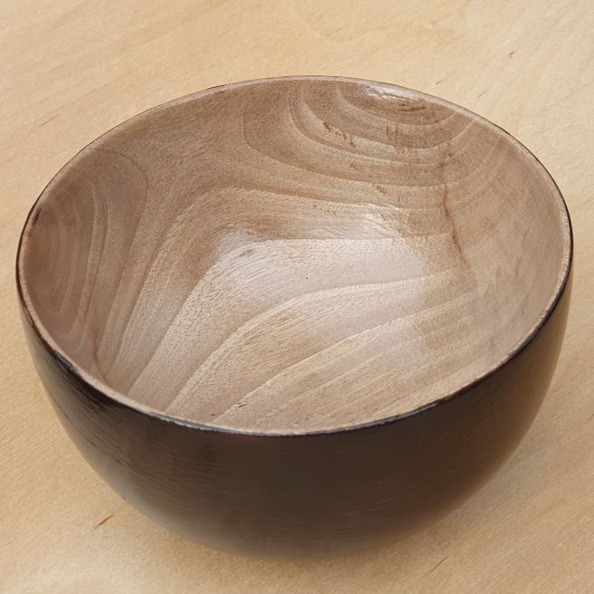 My bowl project went well, thanks. I used the same walnut gloss finish for the outside but a clear gloss varnish for the inside to show the natural wood grain. The first coat of varnish did cause the grain to rise and become rough and so it was necessary to sand it smooth again before the next coat. I am rather chuffed with the result! I did find a long crack or split, about ½” below the rim, which appears to go all the way through suggesting that the bowl might have been dropped at some time in its life. It is no longer easily visible on the inside but is prominent on the outside. A younger me might have been put off by this flaw but now it actually gives me more affection for the bowl – just as we all pick up some scars, physical or mental, as we go through life.