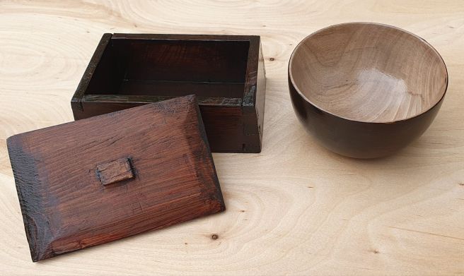 Encouraged by my early efforts, I browsed some more charity shops and found a small wooden bowl, slightly marked but having potential to be restored with some sandpaper, varnish and TLC. This was much smaller and quicker than the pen box project. I use the word “project” to keep up with my wife, who is currently embarking on a project of her own to convert her mother’s garage into a day-room or office space.