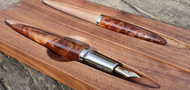 To order, (1) chose one of six wood options, (2) select either gold or platinum for the Bock nib ; (3) chose a nib width of either Fine or Medium, and (4) indicate your chosen name for the engraving. The price is then adjusted automatically, albeit shown only in US dollars or Euros at present. When you click “Add to basket”, the 20% discount price shows in the Summary. You then have the option to “Proceed to Checkout” or to delete the pen from the basket. The choice is yours.