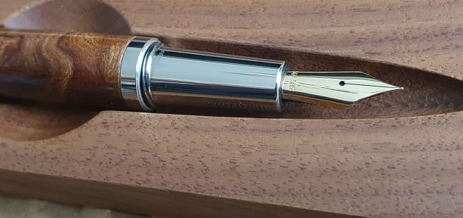 That could have been an end of my Ashera journey. However I was not prepared for quite how bereft I felt in the following few days. Whilst the pen was with me, I had used it at every opportunity with many different inks and read all I could find about it, to write an informed review. The pen was like nothing else in my collection in many ways – its hand polished wood body, its long tapering profile (reminiscent of a desk pen or art pen), its titanium grip section and the unsigned 14k gold nib from Bock. From showing the pen and its wooden box/pen tray to friends I was familiar with potential danger areas: “Be careful – the box lid is held on by magnets; yes it’s a screw-cap; no, don’t try to post it; be careful screwing the cap back on” etc. My review pen, having the elm burl wood body, has a very pretty grain although there are numerous small “holes” in the grain of the cap, seen by shining a light from outside the cap, whilst rotating the cap and peering inside. These all have to be filled when the wood is lacquered and polished, one reason why the elm burl version costs more than the holly or olive wood models.