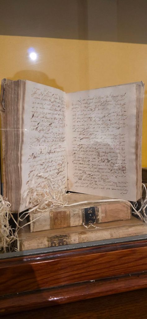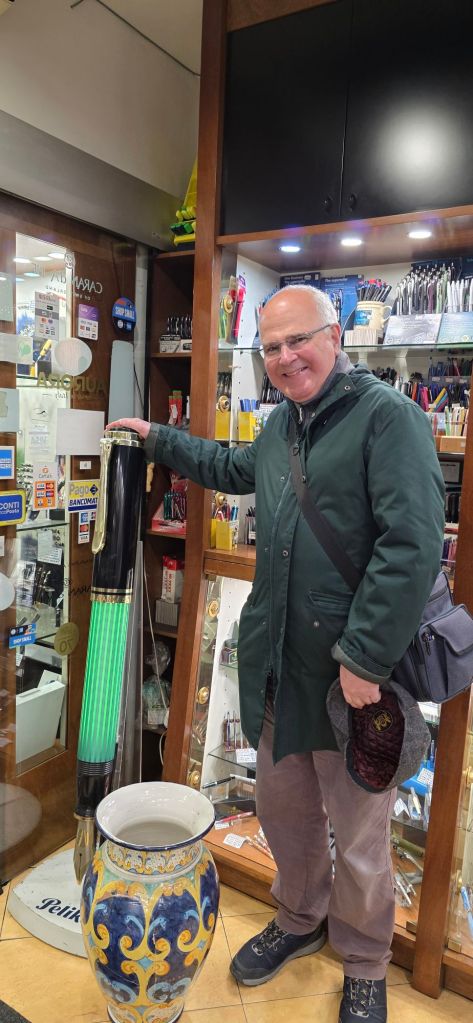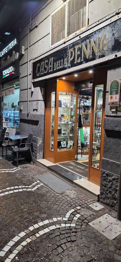 I did visit one delightful fountain pen shop in Naples, Casa della Penna at C.so Umberto I, 88, 80138 Naples, dating from 1937. The friendly proprietor was happy for me to take photographs of his attractive display cabinets, and also switched on the illumination in a giant green Pelikan pen which stood at the entrance. I mentioned that I was visiting from London and had found his shop on an internet search. Whilst there I bought two more boxes of cartridges for my Aurora Style pen – as these are hard to come by at home. He kindly gave me a gift of a 2026 calendar and an accompanying ball pen both bearing the shop’s name.