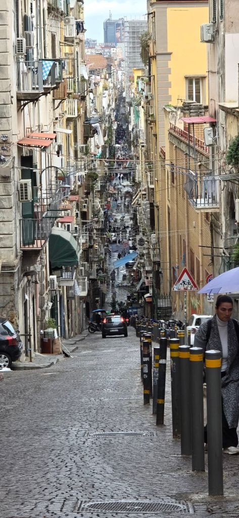 After Rome, my wife and I journeyed on to Naples by train. It was our first visit there. We stayed in a B&B on the third floor of an elegant building on the via Chiatamone, close to the sea front. I later read that the via Chiatamone used to be the coast road until the late 19th century when a new road was built on reclaimed land, now comprising waterfront hotels and restaurants.