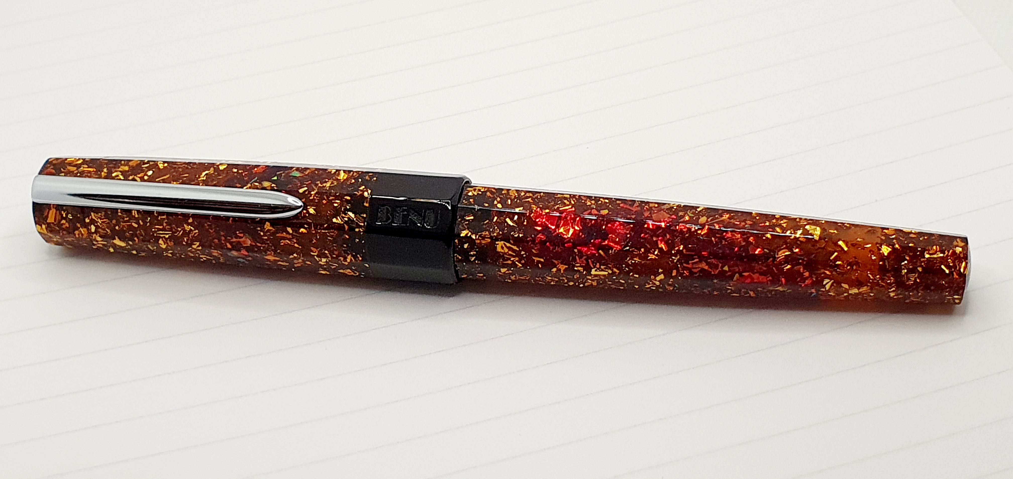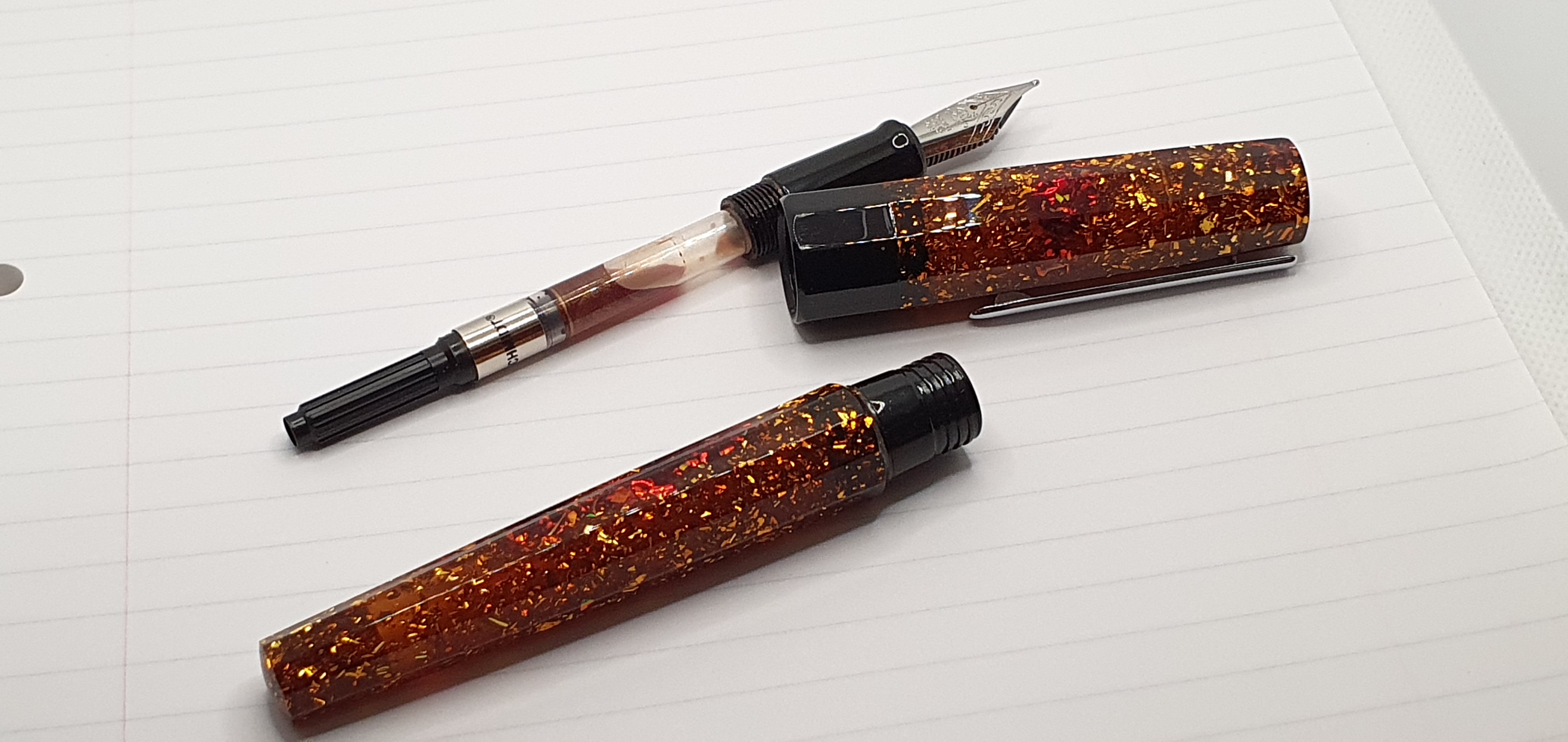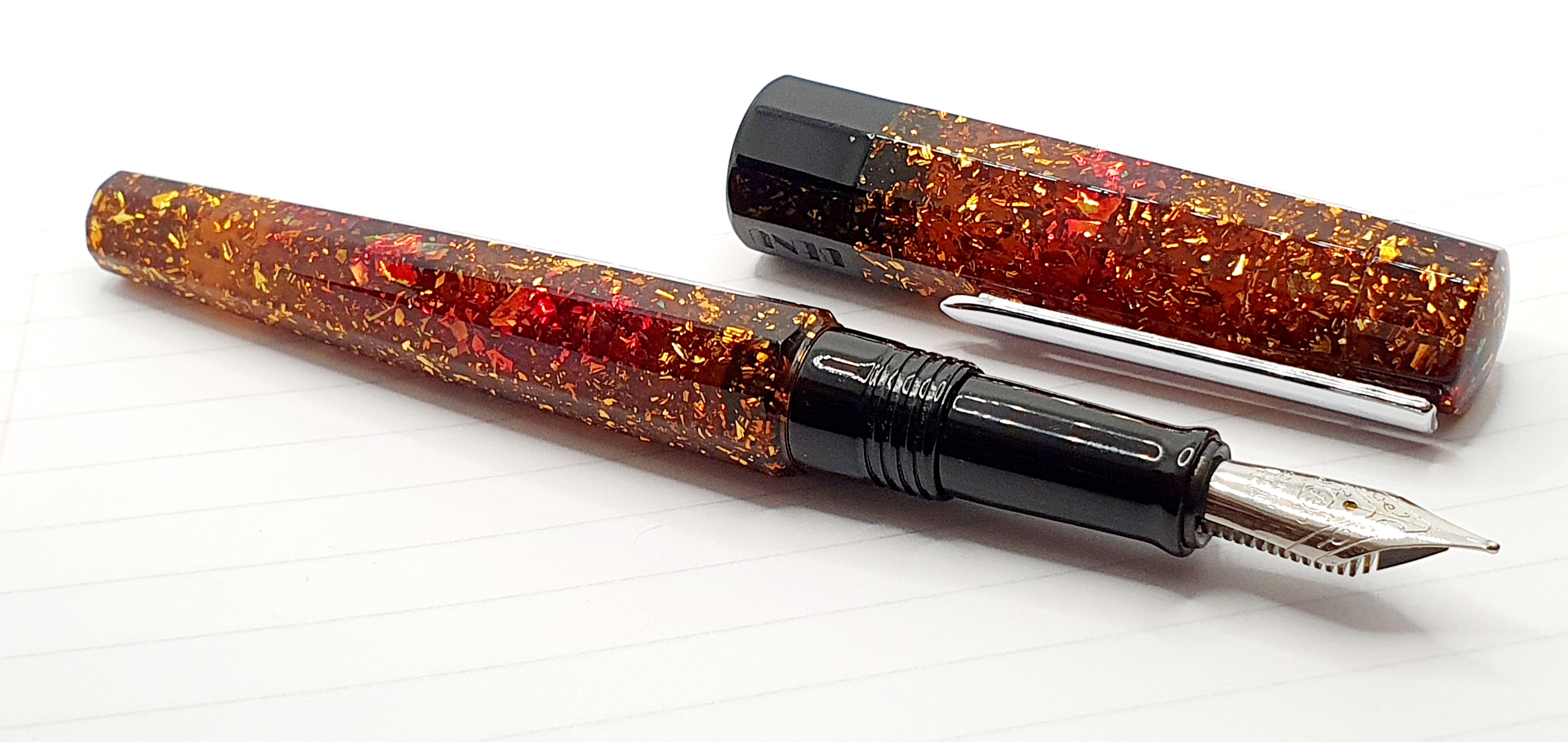 The pen looks and feels, chunky, solid and dense! Capped, it measures around 127mm and uncapped, 123mm. Posted, it is around 157mm. The width of the barrel across opposite facets, is about 12mm. It weighs 44.5g capped, or 27g uncapped and 17.5g for the cap alone. Using the pen uncapped, the weight is very comfortable.