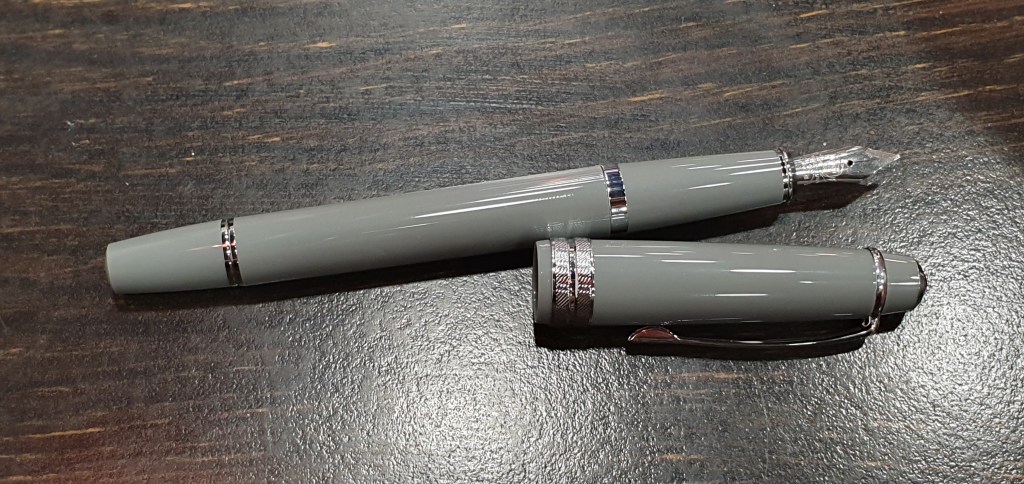 As well as the fountain pens, there is a ball point pen available in the same range of colours. I bought a grey one to try. It has the same pleasing aesthetics as the fountain pen and is operated by twisting the cap.