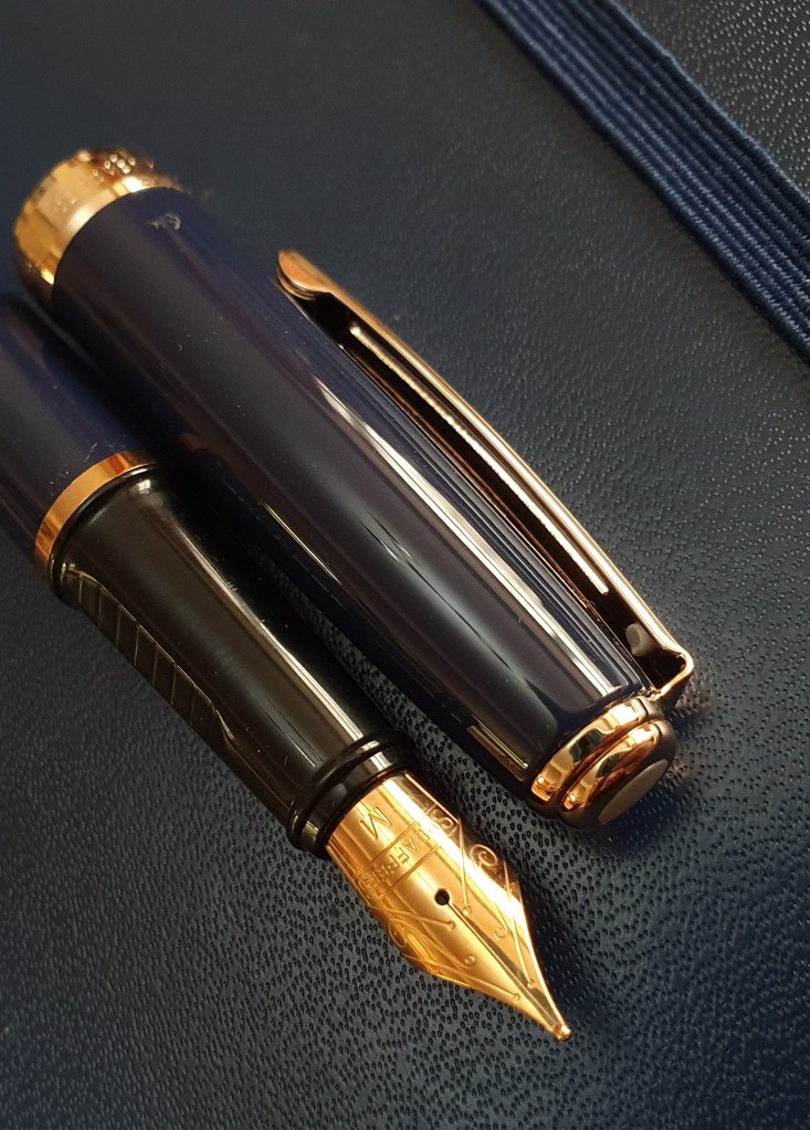 On the plus side, the pen feels solid, well made and indestructible. It has a good sizeable girth, (broader than the Sheaffer Sagaris) and the nib on mine writes very nicely. The pen seems built to last, of sober design and good value for money. Other colours or a chrome cap version are available.